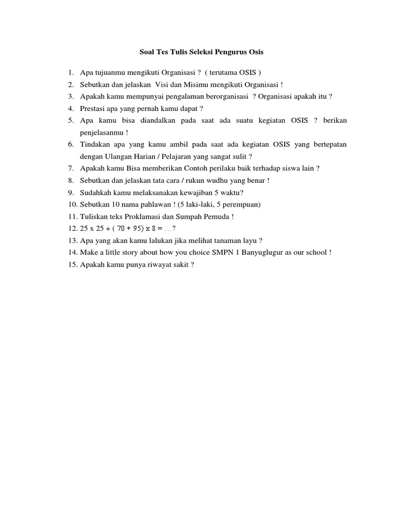 Ketua osis mengundang pengurus osis soal 1. Contoh soal seleksi osis sekbid tik. Last record about terbaru soal dan jawaban seleksi osis smp. Documents similar to soal tes calon pengurus osis. Soal tes calon kepsek prediksi soal tes 5.